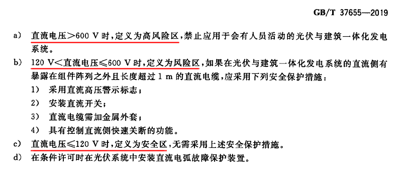 3、中国标准GB/T37655-2019《光伏与建筑一体化发电系统验收规范》6.7条定义直流电压≦120V时,为安全区,无需采用安全保护措施。同时定义高于该电压所有电缆必须加装金属外套和直流拉弧快速关断控制。